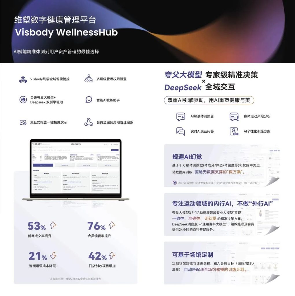 产品层面,维塑科技在最新型号的智能体测设备上都搭载了AI数字健康管理平台(Wellnesshub)可实现AI解读体测报告,身体运动风险评估,生成个性化训练方案,全面赋能场馆运营服务,抢先进入数字化运营时代。
