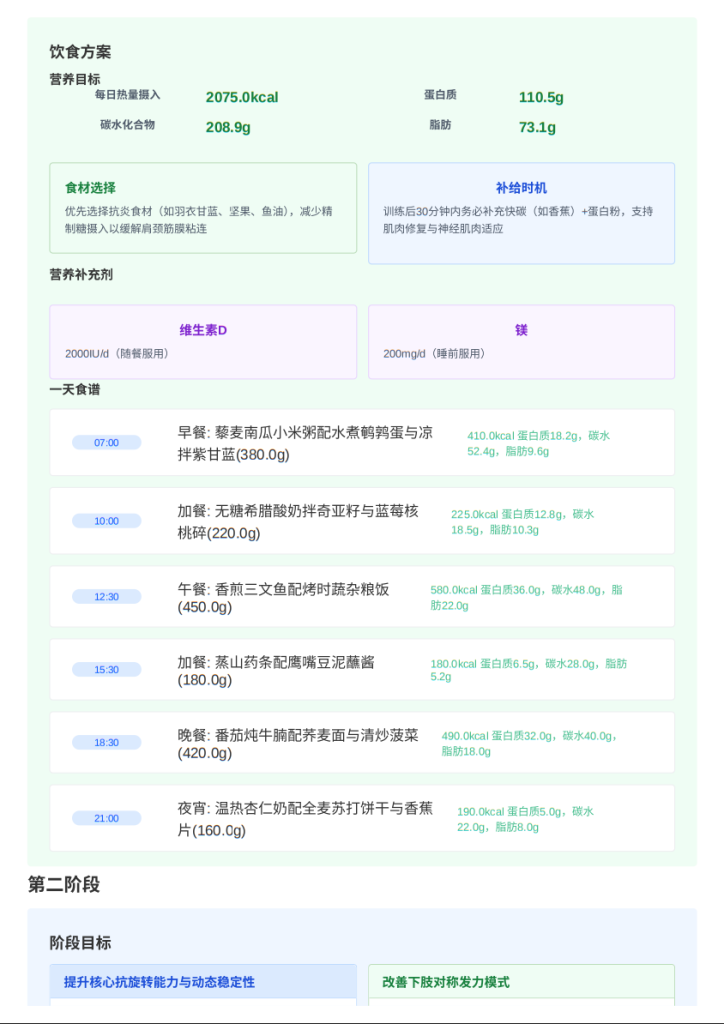 在营养层面,系统关注营养素的平衡与摄入结构,可结合地域、年龄、人群状态提供方向性饮食建议,辅助教练完成科学指导。