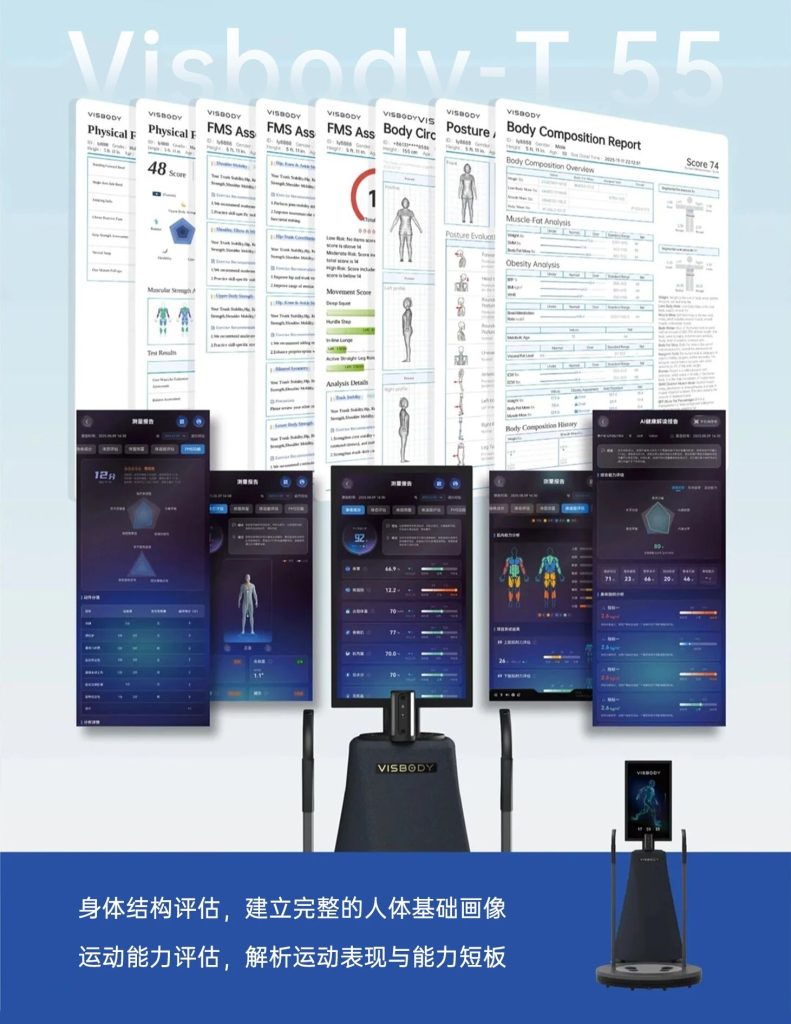作为首台搭载Visbody Simulation System的旗舰产品,Visbody-T5X实现了由表及里,深入身体内部的推演和模拟。可以输出身体趋势预测、健康风险判断和干预效果模拟,让评估能力从结果识别走向趋势理解与智能推演。