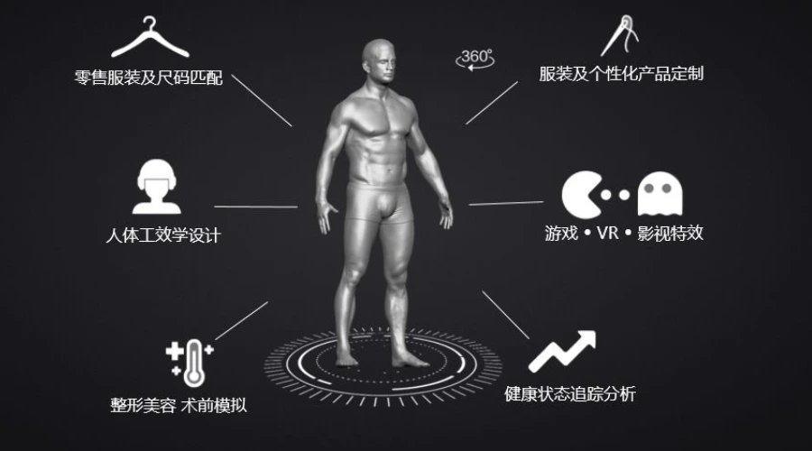 三维人体重构绝不仅限于面部识别,从面貌体型到姿态动作,从特征识别到规律分析,分析处理后的身体数据可以应用到消费、安防、工业生产、智能制造以及文化娱乐等各个领域。采用3D重构的方式,可以一次性获取包含面部、体态以及体型等信息在内的全维度身体数据,拥有极大的深度挖掘价值。
