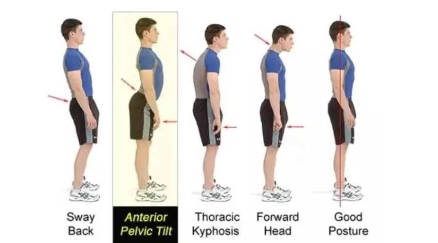骨盆前倾会引起内脏下垂, 小腹凸起、臀部横向发展、下垂等,进而破坏身体曲线,同时加速脂肪在体内堆积。