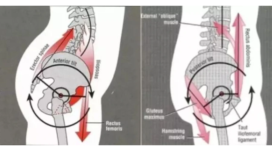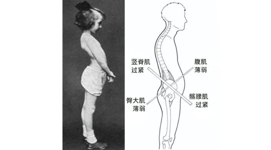 运动康复专家仔细研究了这种体态异常,发现是由于有的肌肉过紧,有的肌肉过度松弛无力,导致骨盆失去了正常拮抗肌肉的制衡作用,在过紧的肌肉拉动之下发生了骨盆前倾,继而引发姿态异常。