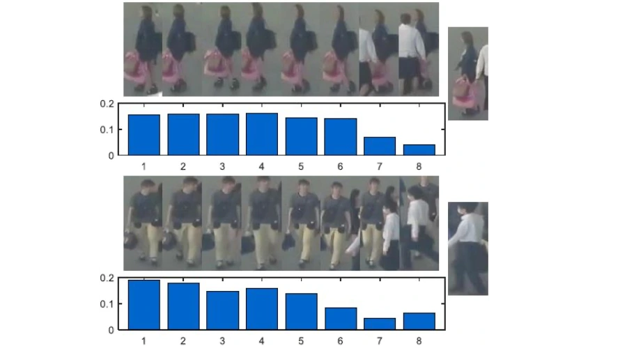 为了验证所提出模型的作用,我们可视化了数据关联过程中的比对效果。图5可视化了空间域的关注度区域,其中红色高亮区域为模型比对时重点关注的区域。我们可以看到,虽然比对的行人图片对存在位置偏移、遮挡、目标干扰和尺度不一致等现象,模型依然可以关注到两张图片中相对应的区域而忽略非相关区域。图6可视化了时间域的关注度评分,其中柱状图的高低反映了模型对轨迹中样本的关注度大小。我们可以看到,模型能够准确定位目标轨迹中地噪声样本,从而减少其对匹配结果的干扰。