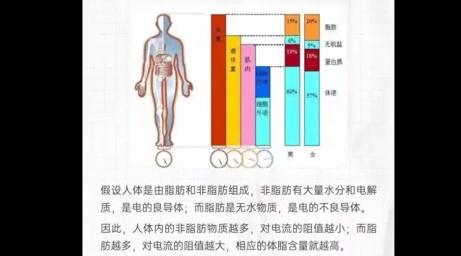 BIA技术的核心原理,就是电流通过人体不同组织产生的电阻大小来进行计算的。最早采用50kHz的单一频率电流进行测量,电流无法穿过细胞内部,数据真实性较差。随着技术的不断进步,电流的频率逐步增加,从5kHz到250kHz不等,电流得以穿透细胞组织,得到的体成分数据也从单一的体脂率增加到肌肉量、骨骼肌含量、蛋白质、无机盐、总水分等多项信息。