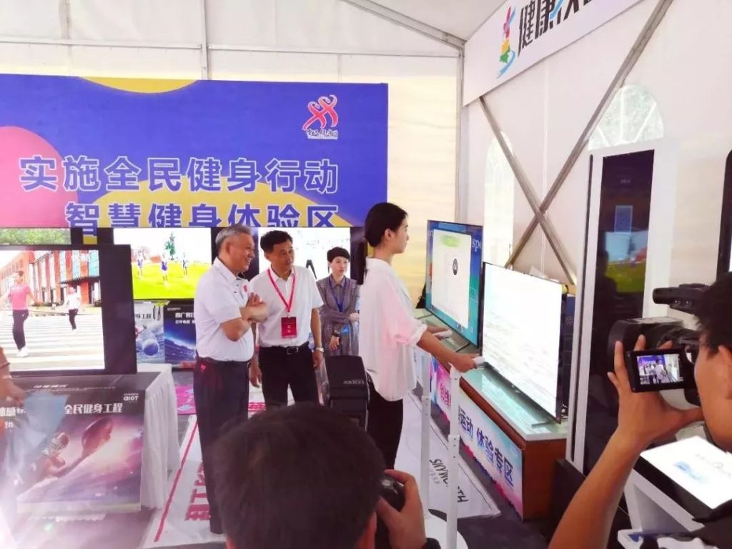 ▲陕西省体育局副局长董利陪同国家体育总局群体司司长郎维在2019陕西全民健身日参观指导维塑3D体型追踪仪