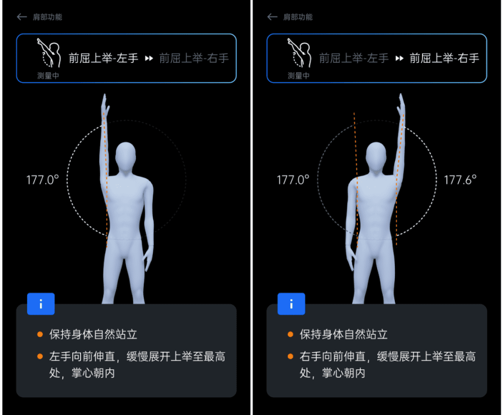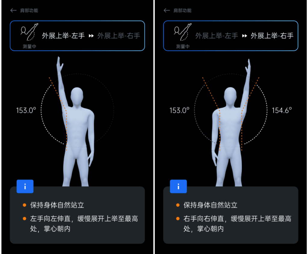 「肩部功能评估」作为维塑Visbody D全新上线的特色功能之一,采用动态识别技术实时捕捉用户手臂前屈、外展的活动轨迹,全方面评估左右肩部的屈曲和伸展度,有效避免人工肉眼判定所存在的各种弊端。