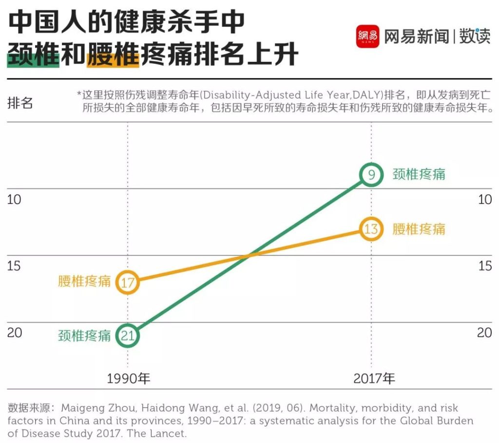 在用于衡量疾病带来健康寿命损失的伤残调整寿命年(DALY)排名中,1990年排名21位的颈椎疼痛在2017年跃升到第9名。