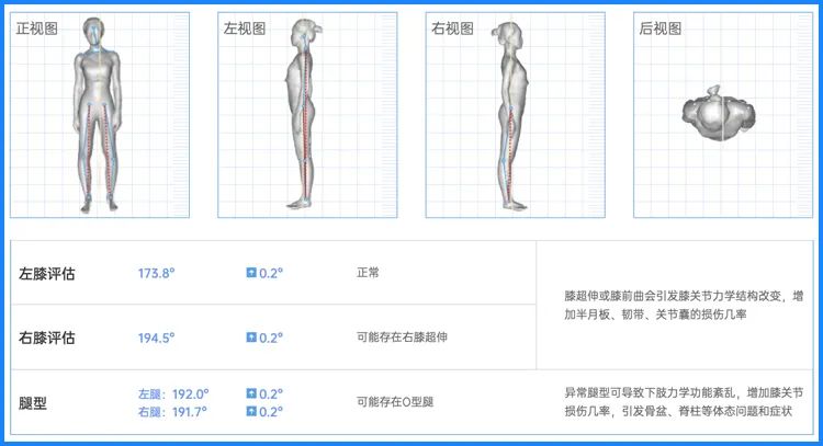 维塑Visbody D通过三维骨骼点检测技术,可实现毫米级精度的体围测量,3D智能体型分析,关节灵活度分析,头部、肩部、骨盆、X/O/K/D腿型及膝关节等静态体态评估与不良体态风险预警,以及采用BDA及BIA融合算法实现医疗级身体成分监测,可检测细胞内外液含量,判断免疫力水平,为用户及教练提供更精准的参考数据。