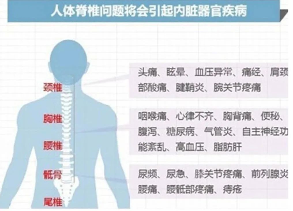 脊柱作为人体的支柱,神经的中枢,与全身很多疾病都有千丝万缕的联系。有统计显示,肩颈部酸痛、膝关节疼痛、头痛、高血压、脂肪肝在内的多种疾病都和脊椎问题有关。