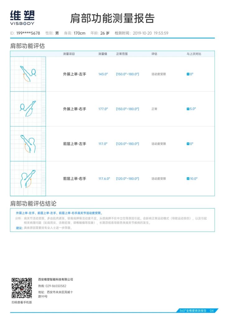 同时,「肩部功能评估」依托由维塑独家AI视觉及光学三维重建技术在40秒内生成的用户高精度真实3D人体模型,采用人体模型识别与理解算法,对人体模型的关键部位进行标注,以帮助计算机进一步理解和分析人体模型,从而能够精准评估肩关节灵活度。