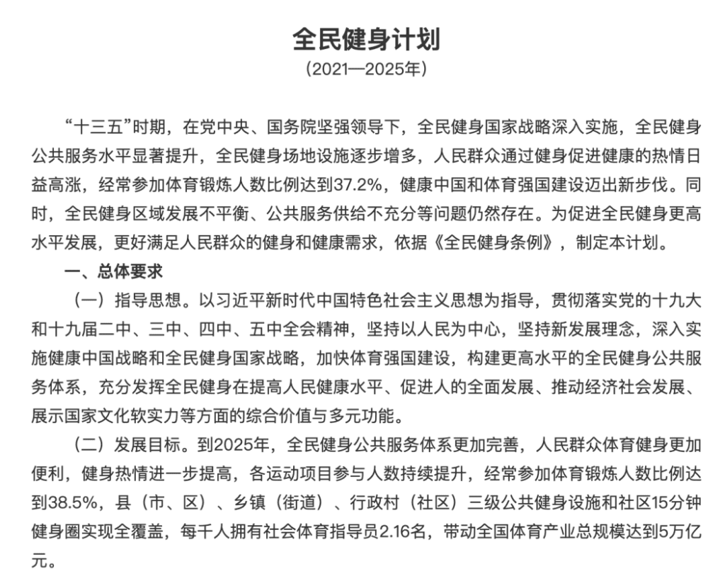 随着国务院《全民健身计划2021-2025》的发布,全民健身的热潮再一次被唤醒,「5年目标」与「8大方面」的政策支持,就是要从根本上满足百姓的健身需求。这也是为2035年建成体育强国、实现健康中国的远大目标最基础的保障。
