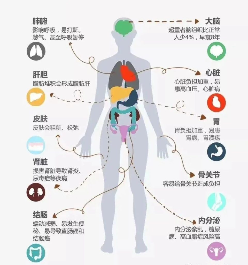 体脂率越高,体内脂肪含量越高,对健康的潜在影响也就越大!许多慢性疾病都是由于肥胖引起的。