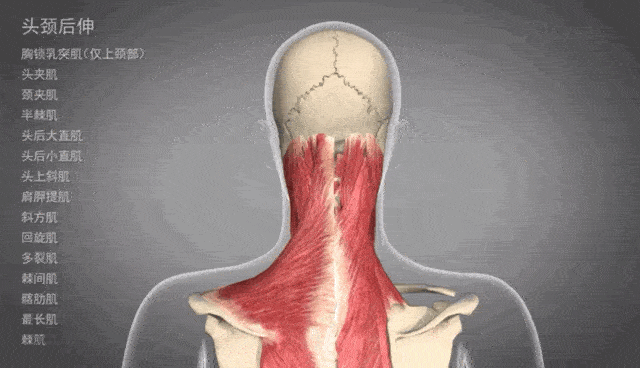 △颈部后伸:由胸锁乳突肌、半棘肌、头夹肌、肩胛提肌、颈夹肌、斜方肌等引发运动。颈部后伸活动度约为35°-45°。