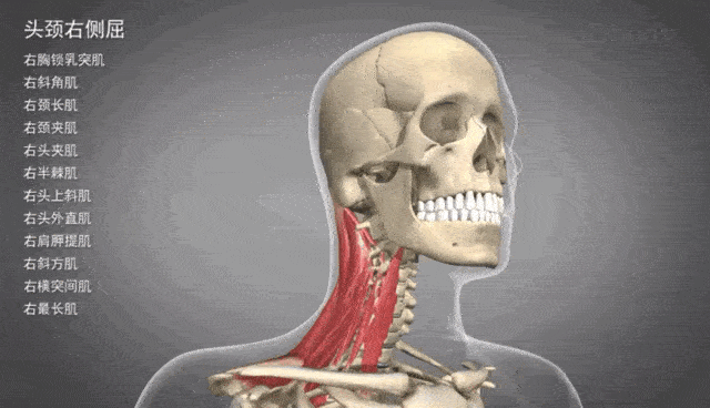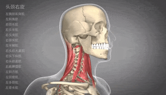 △颈部旋转:由头前直肌、头夹肌、颈夹肌、颈长肌、肩胛提肌、对侧胸锁乳突肌、对侧斜角肌等引发运动。颈部旋转活动度约为60°-80°。