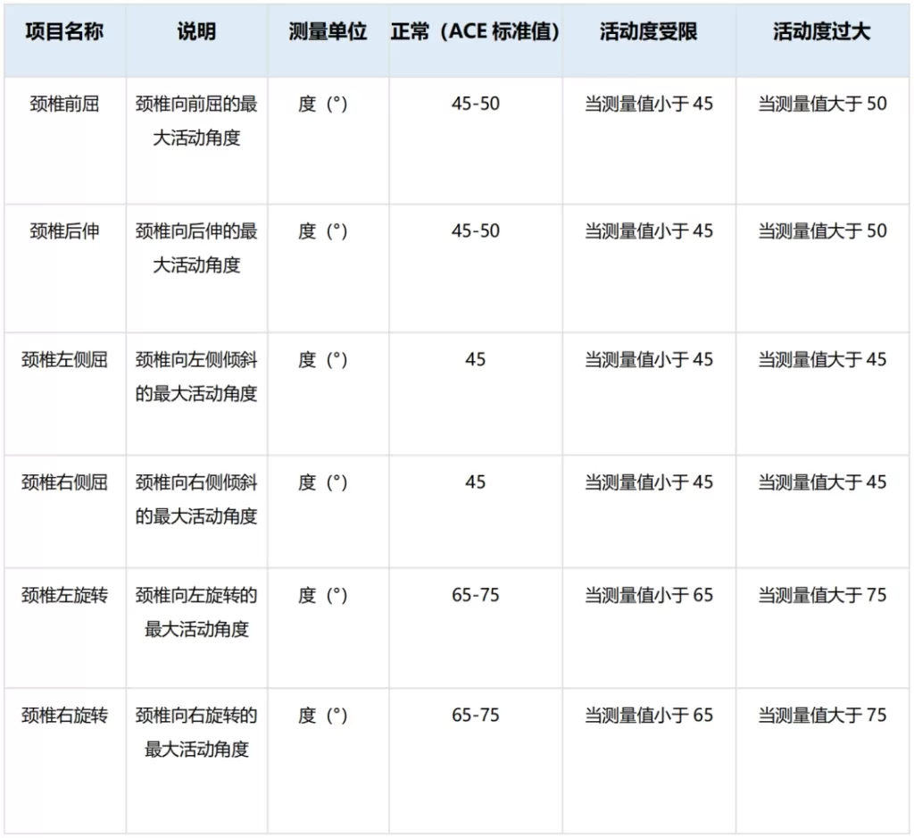 颈部功能评估相应的检测结果,能够提供给被测者以及相关专业人士进行进一步的筛查和治疗。具体项目如下: