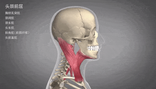 △颈部前屈:由胸锁乳突肌、颈阔肌、颈长肌、头长肌、斜角肌、头前直肌等引发运动。颈部前屈活动度约为35°-45°。