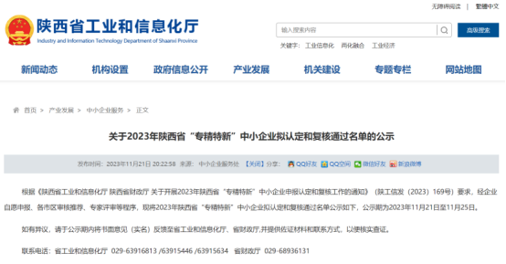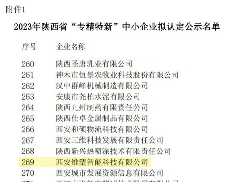 11月21日,陕西省工信厅公示了“2023年陕西省“专精特新”中小企业拟认定和复核通过名单”,西安维塑智能科技有限公司(以下简称“维塑科技”)成功入选“专精特新”企业!