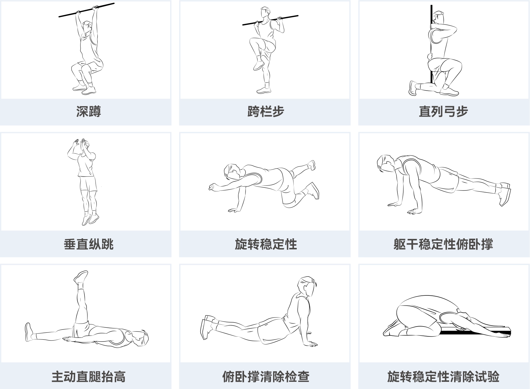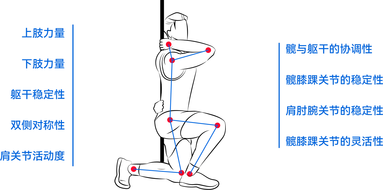 针对受测者进行九个基础动作评估,可分析出多个维度的身体数据