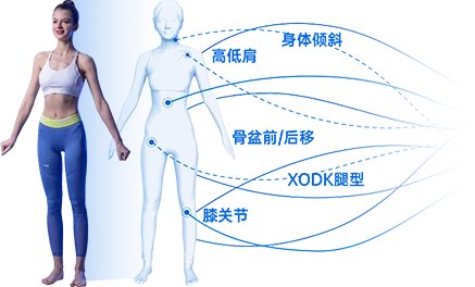 通过独家专利的人体三维扫描专利与骨骼点检测技术,完成膝关节、XODK腿型、骨盆前/后移、高低肩等9项体态评估,3D 体态测量仪可直观呈现真实人体模型。